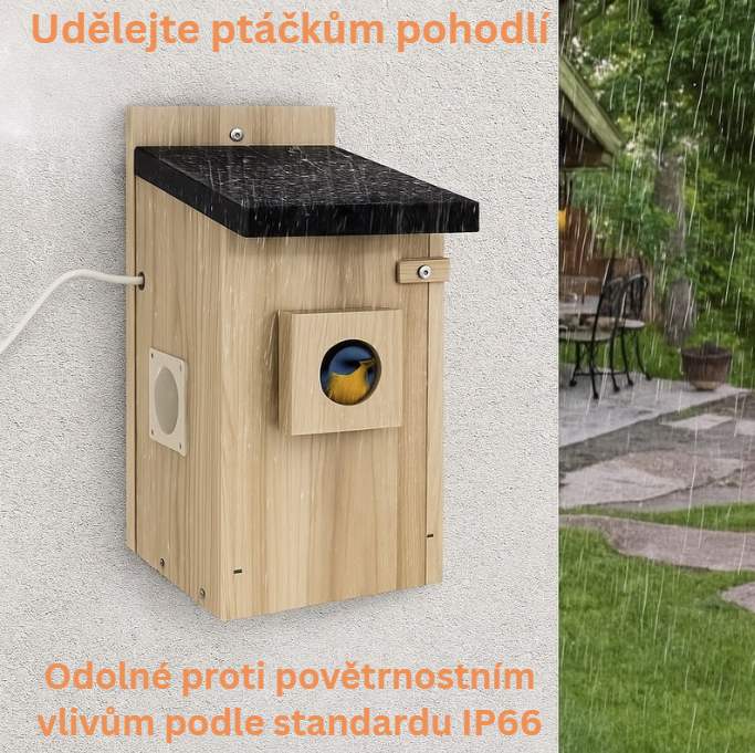 Pokud kamera v budce detekuje aktivitu ptáků, okamžitě obdržíte upozornění na svůj telefon. Tato kamera v ptačí budce má 5milion pixelový fotoaparát, vestavěný mikrofon a noční vidění. Můžete sledovat vzhled a chování ptáků online se svou rodinou kdykoli, ve dne i v noci, a dokonce i poslouchat jejich zpěv.
