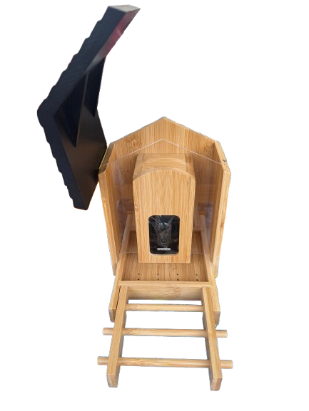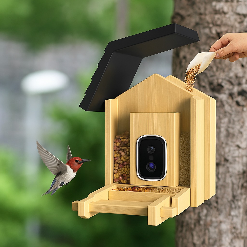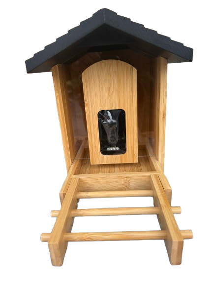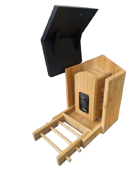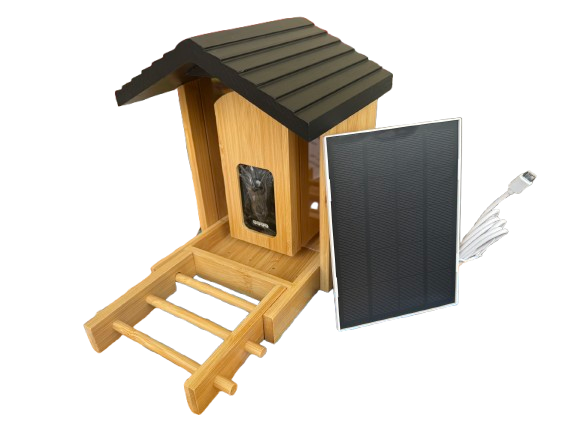 Krmítko má odolnou konstrukci z přírodního dřevěného/bambusového materiálu, takže hezky zapadne na zahradu i balkon. Montáž je jednoduchá – součástí balení je držák na strom i závěsný držák. Celé zařízení je voděodolné (IP65), takže zvládne déšť i sníh.
